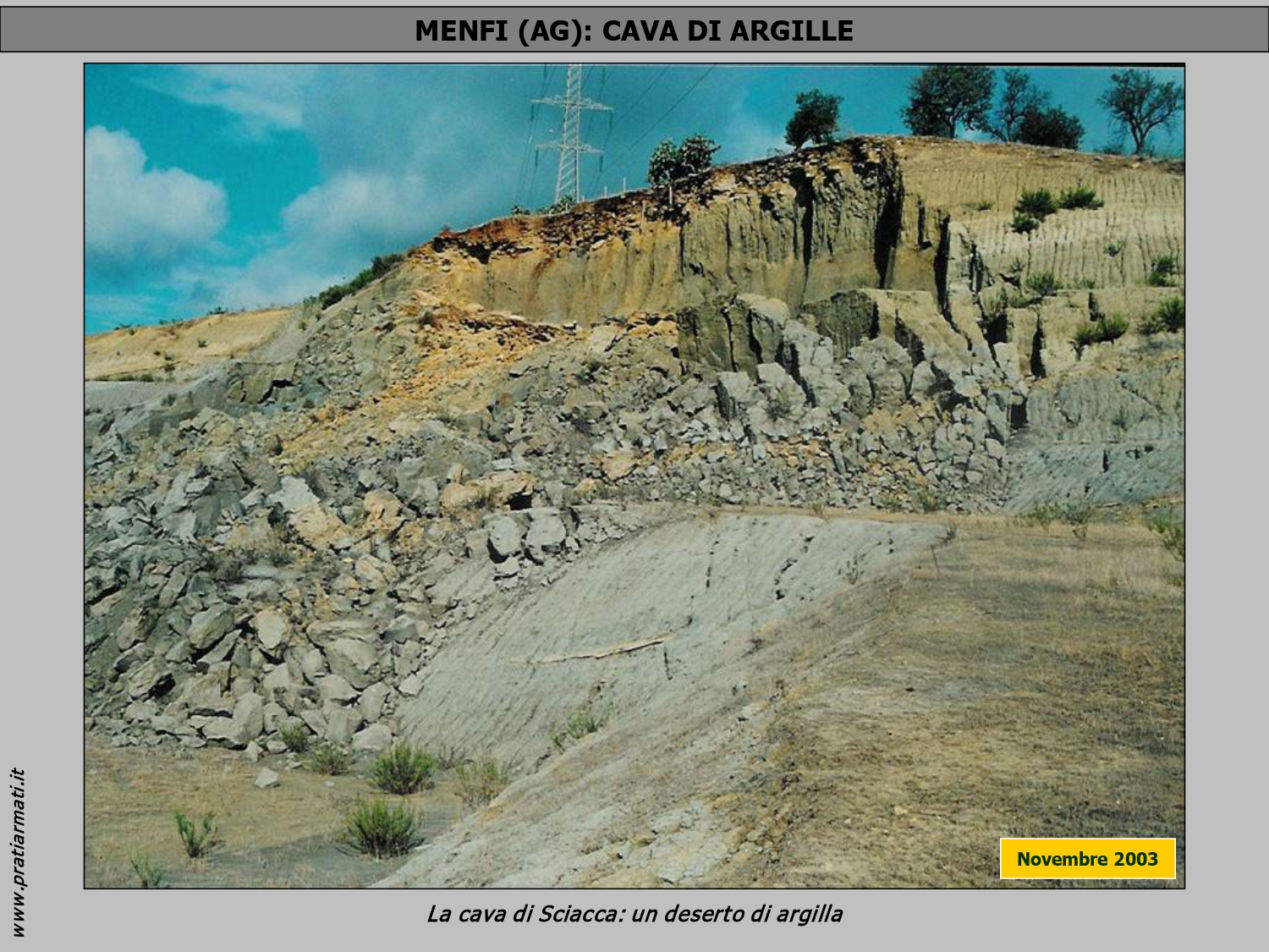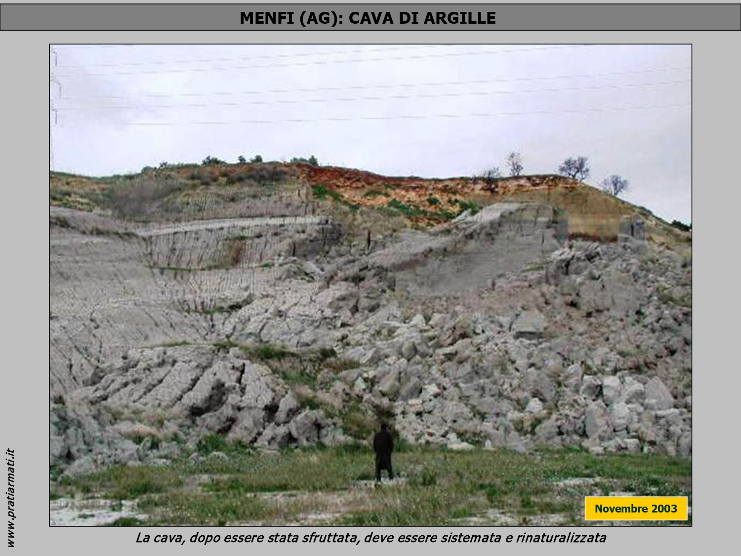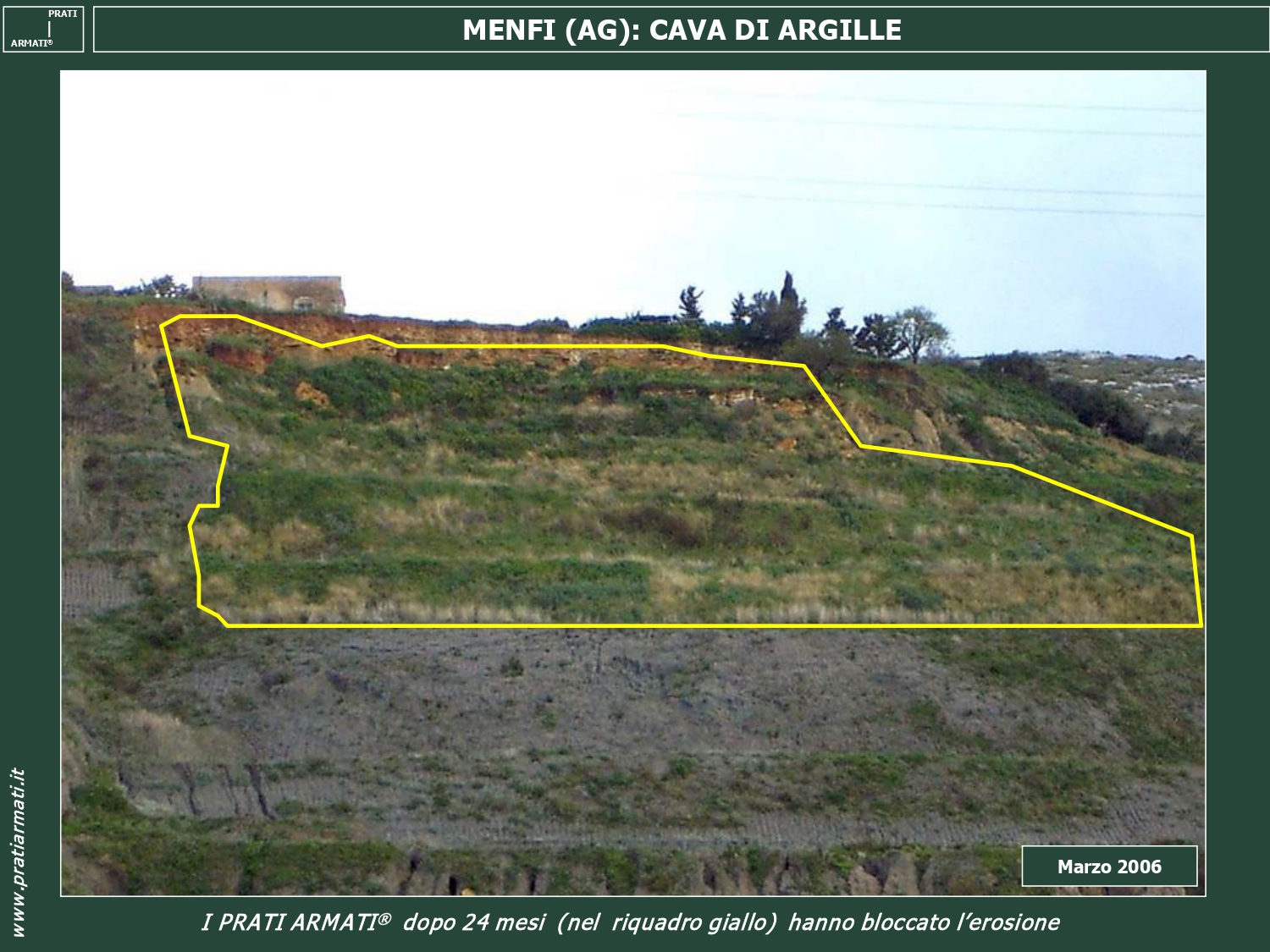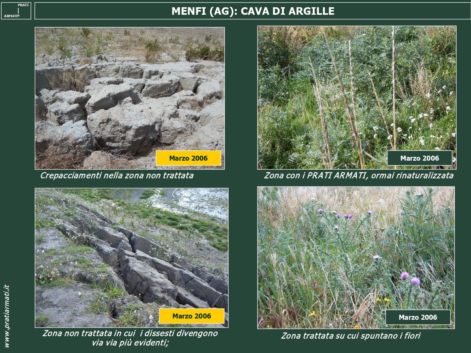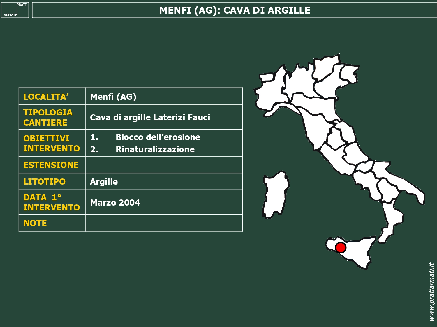 A novembre 2003 Prati armati Srl viene chiamata a Menfi, provincia di Agrigento, per rinaturalizzare la vecchia cava dismessa di argille.