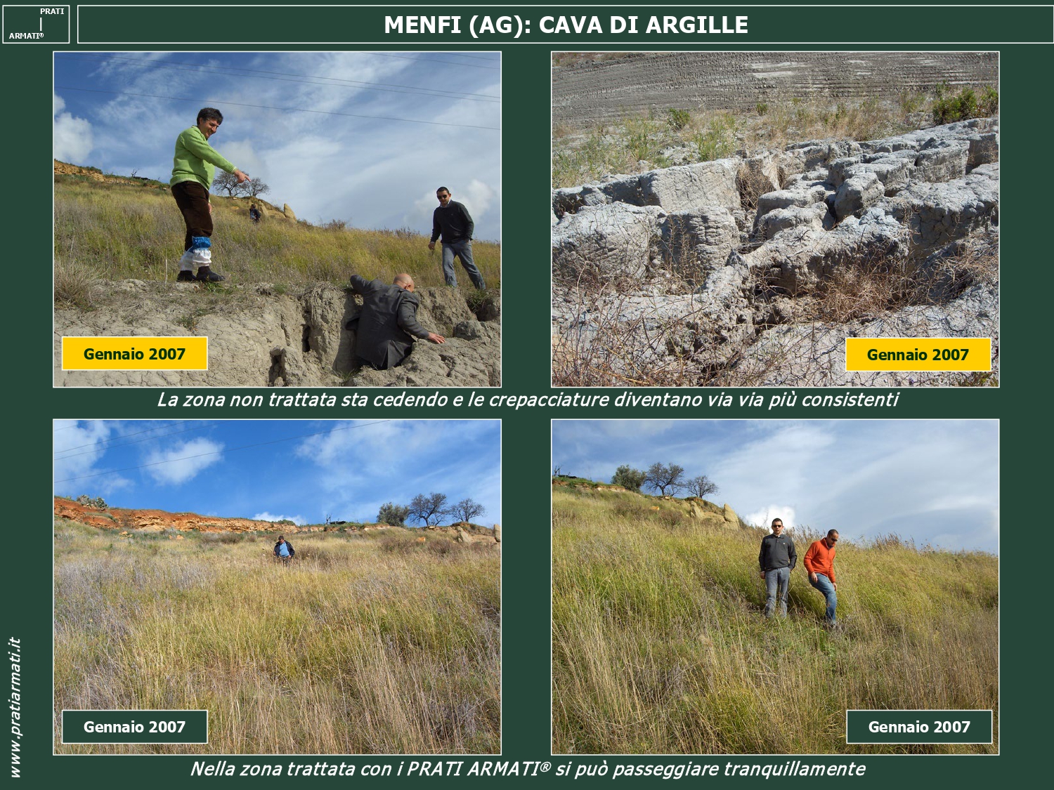 Le zone trattate con i Prati Armati® sono verdi e non sono più presenti crepacciamenti né fenomeni erosivi e calanchivi, mentre nelle zone non trattate l’erosione è attiva e continua la sua azione di approfondimento e d’instabilità.