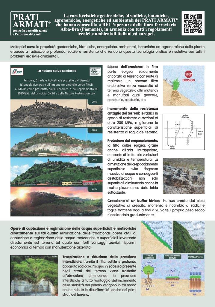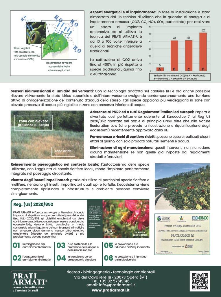 Nel novembre 2019 si è stata eseguita la semina dei Prati Armati® che ha consentito oltre al blocco dell’erosione, la realizzazione di opere di regimazione e captazione delle acque meteoriche e superficiali direttamente sul tal quale e la rinaturalizzazione del cantiere come previsto nei capitolati di RFI per un completo reinserimento paesaggistico nel contesto locale. La semina di particolari essenza fiorifere in accordo con gli apicoltori ha consentito il ritorno delle api.